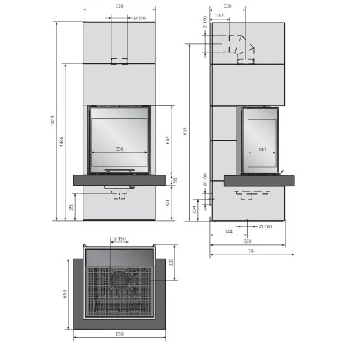 – Maße Sichtscheibe für Club Tre 8 kW : 1828 x 648 x 690 mm (Höhe x Breite x Tiefe)