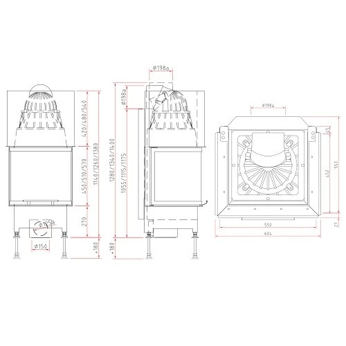 Trotz seiner beeindruckenden Leistung und Ausstrahlung benötigt dieser Kamineinsatz nur wenig Platz. Mit Maßen von 1260 mm bis 1380 mm in der Höhe (abhängig von der ausgewählten Türhöhe) und einer Tiefe von 553 mm passt er problemlos in jeden Raum.